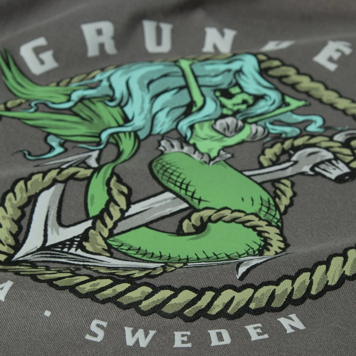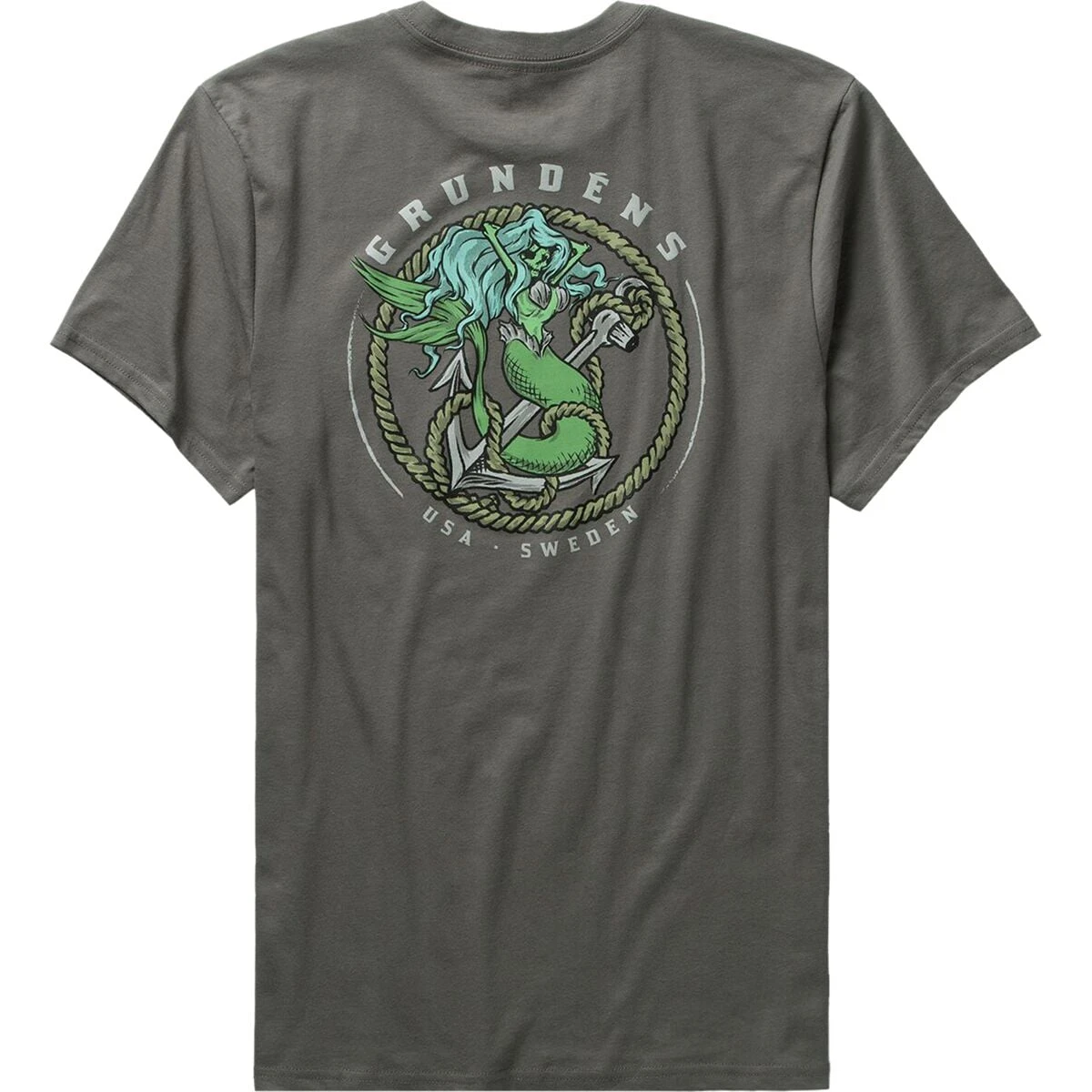 The Grundns Mermaid Tee tempts you with its siren song, luring you in with its hand-drawn beauty before dragging you to the murky depths of Davey Jones Locker. Beware the mermaid…