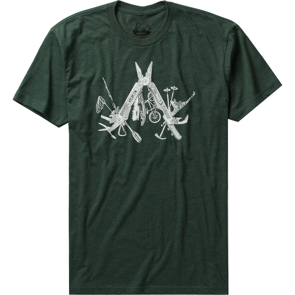 Multitool is printed in white ink on Heather Forest Green cotton/poly* tees.